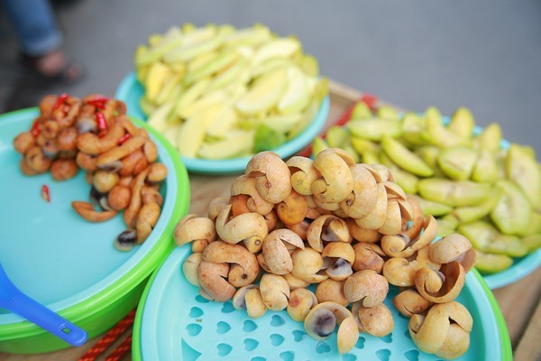 Quả chua dầm: Các thứ quả chua và giòn như xoài, mận, cóc, ổi (tùy theo mùa) trộn cùng đường, ớt bột là thức quà vô cùng hấp dẫn đối với các chị em. Món ăn này có giá trung bình từ 8.000 – 10.000 đồng/ lạng (có thể cao hơn chút đỉnh tùy thời điểm và loại quả).